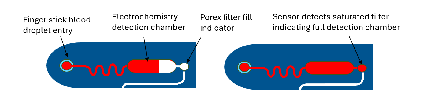 Tensentric developed a sensor to visually detect a droplet of blood drawn into a microfluidic chamber under capillary action. Detecting the droplet ensures that a sufficient volume of blood has been retrieved from a patient’s finger prick to complete an assay.