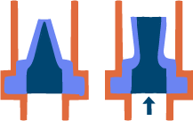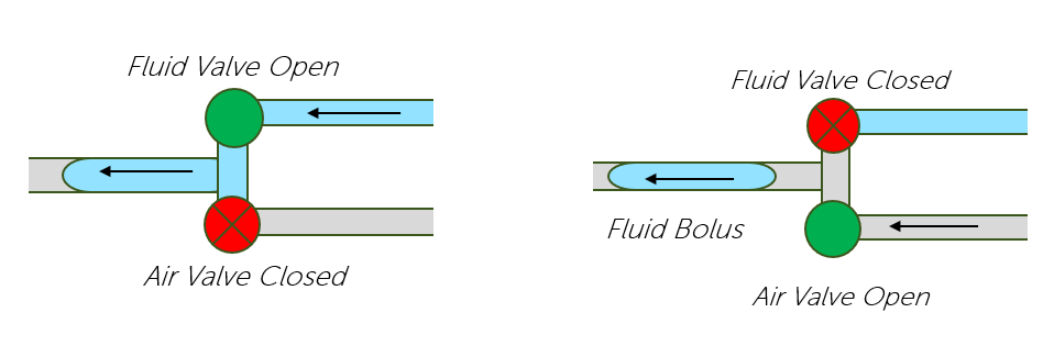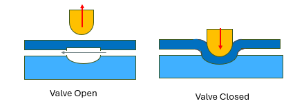 A pinch valve offers a simple means of stopping flow. It consists of a flexible elastomeric layer that is compressed against a rigid surface to pinch off a fluid channel. An instrument–driven piston presses the fluid channel closed. Pistons may be driven by pneumatic, motorized, or solenoid actuators. Tensentric has designed valves that eliminate fluid capture and minimize fluid displacement during closing.